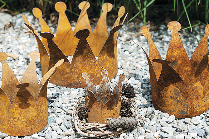 Ich zeige dir alle meine Tricks und du kannst aus bereits rostigem, speziell zur Herstellung von Kronen geeignetem Blech jene Kronen-Grössen herstellen, die dir gefallen und dienen. Es können bis zu vier Kronen im Durchmesser von je nach Wahl ca. 7-30cm entstehen! Dein Dekoherz darf höher schlagen, denn selbst gemachte Kronen sind einfach königliche Blickfänge:-) ... und stell dir erst die grosse Krone vor: mit Zapfen, Kerze und weihnachtlicher Deko auf einem Teller!